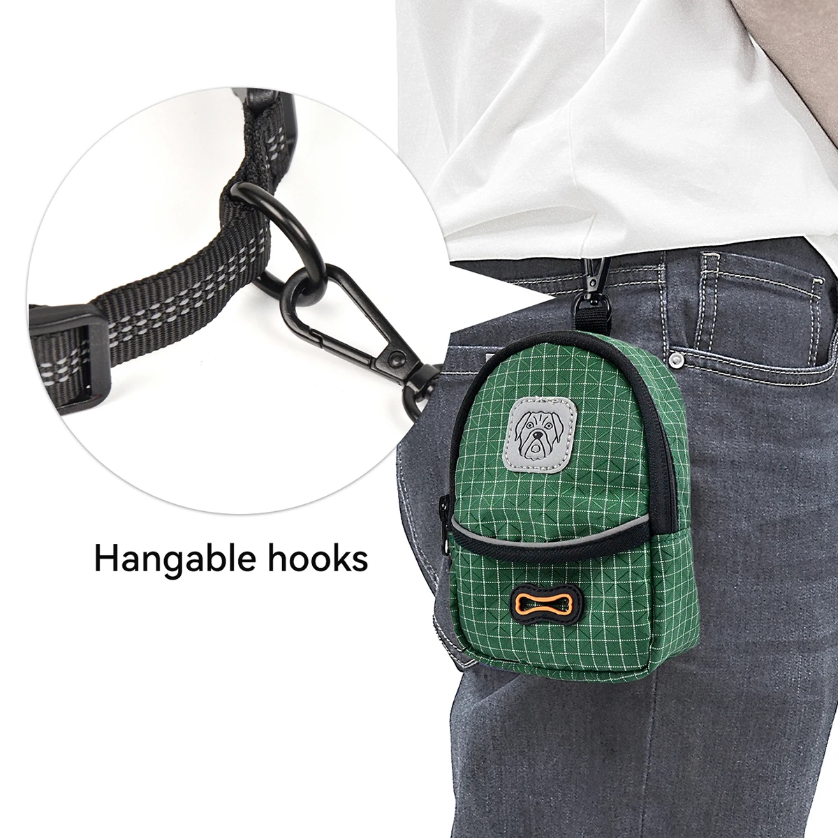 Dog training treat bag, leak-proof large capacity, fits all body types, an essential piece of gear for dog walking activities.