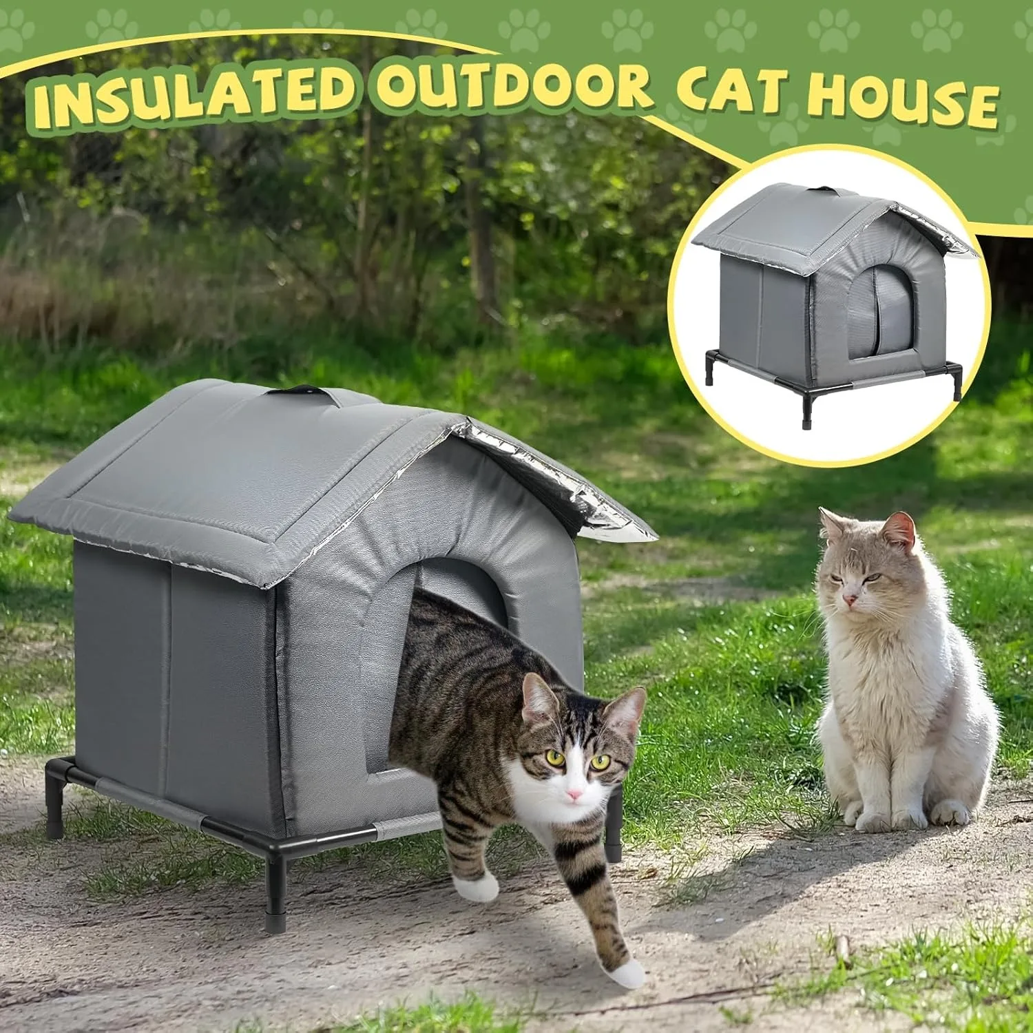 【Elevated Stand】: The weatherproof cat tent with elevated feet, keeps it off the ground and is waterproof and moistureproof. It comes with a soft pad inside, which is warm for pets