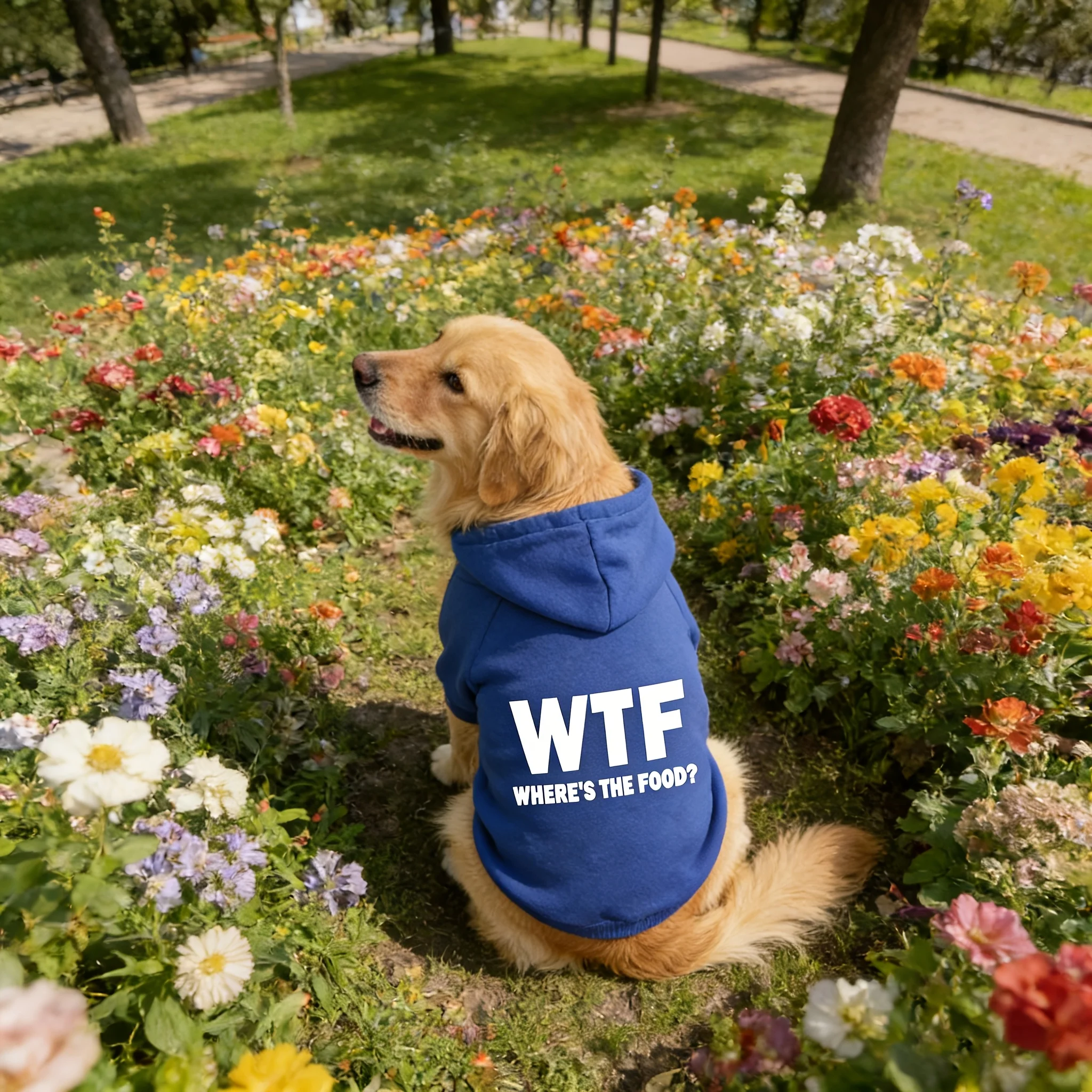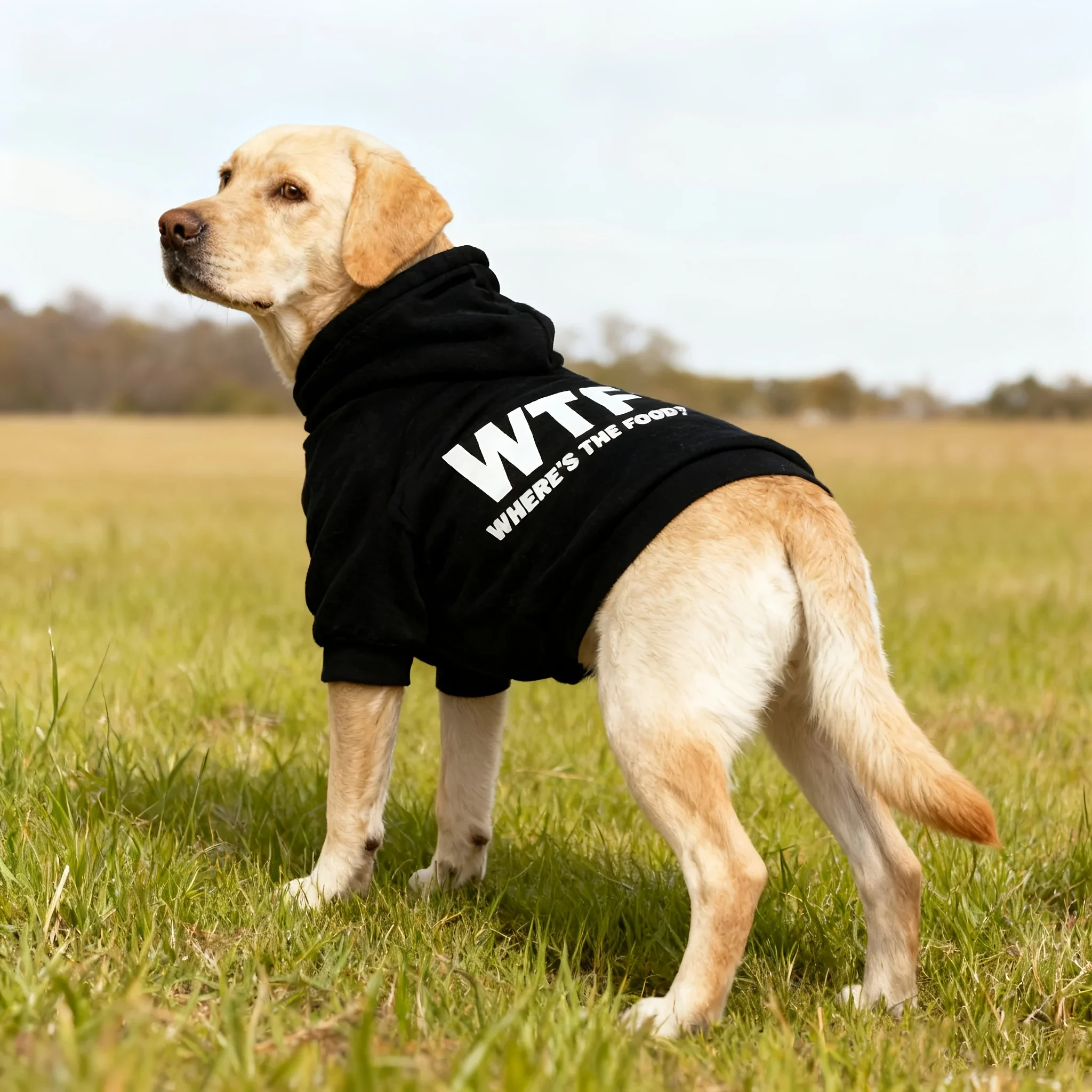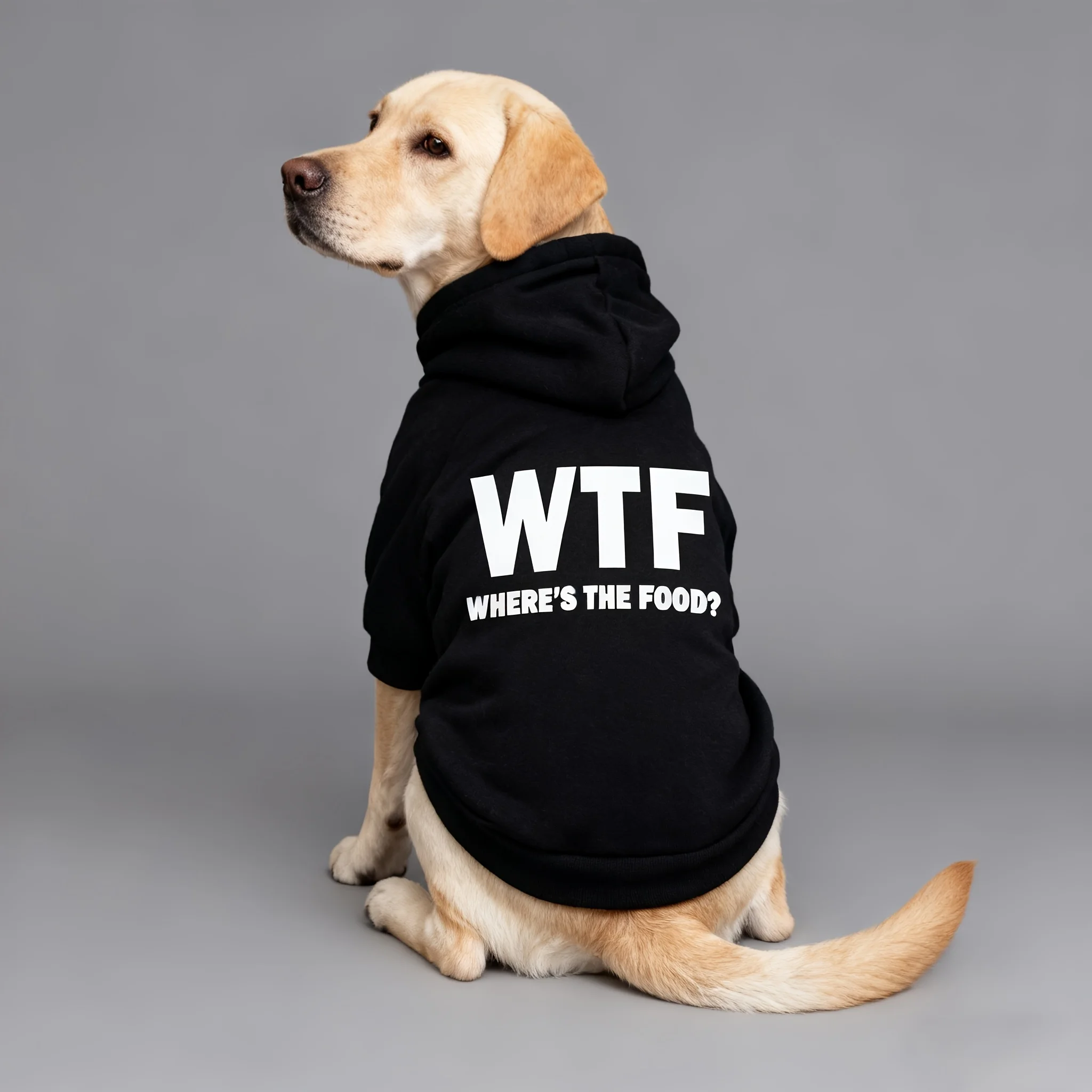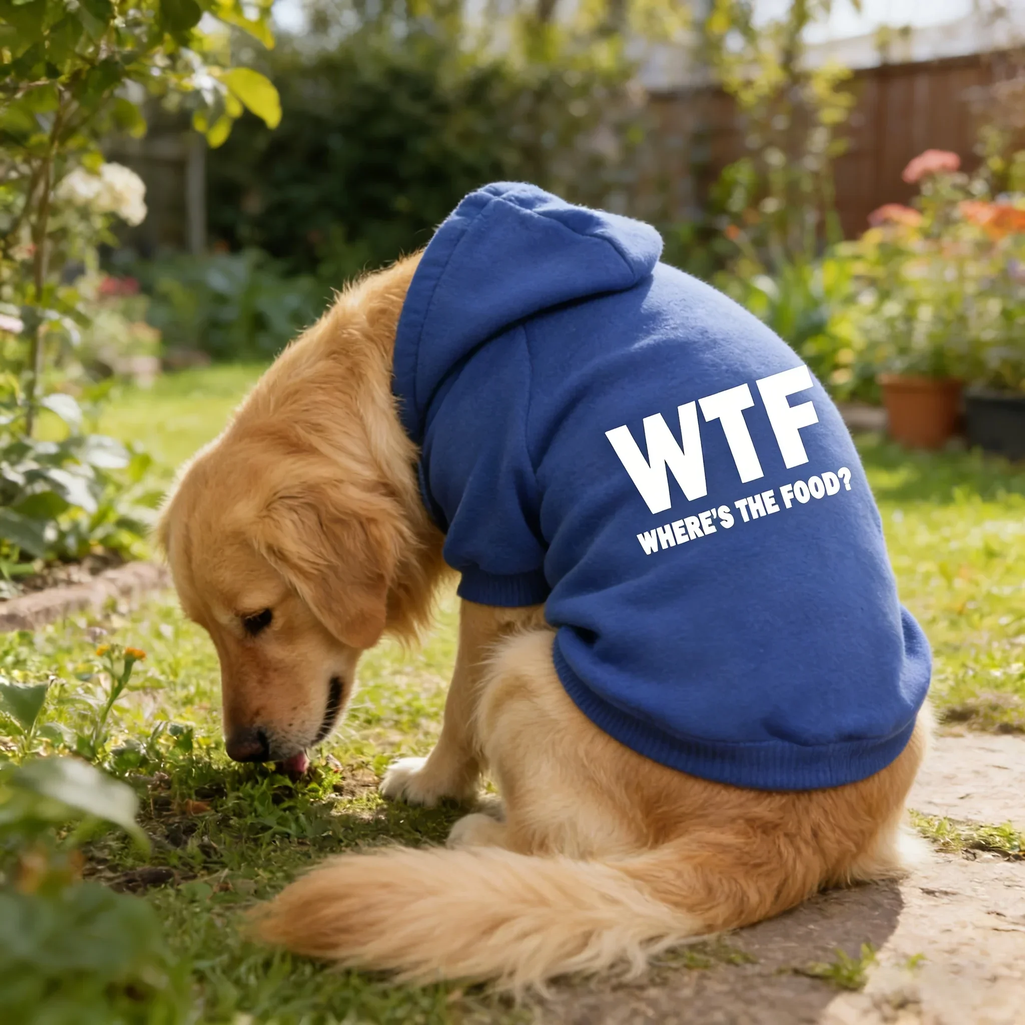 This New Pet Hoodie Features A 'WHERE'S THE FOOD?' Print, Designed Specifically for Medium To Large Dogs