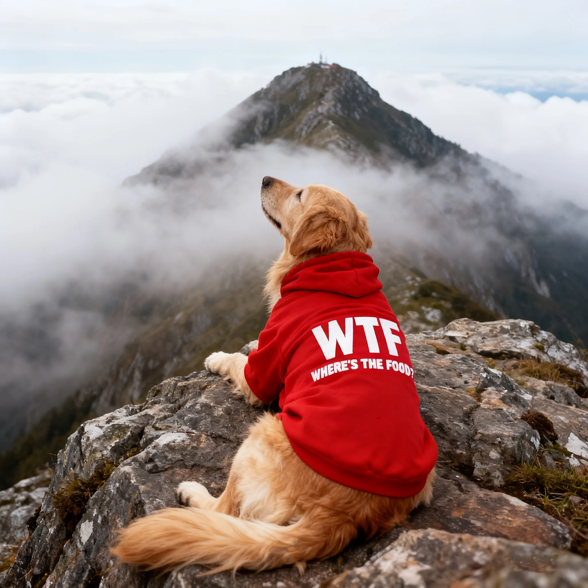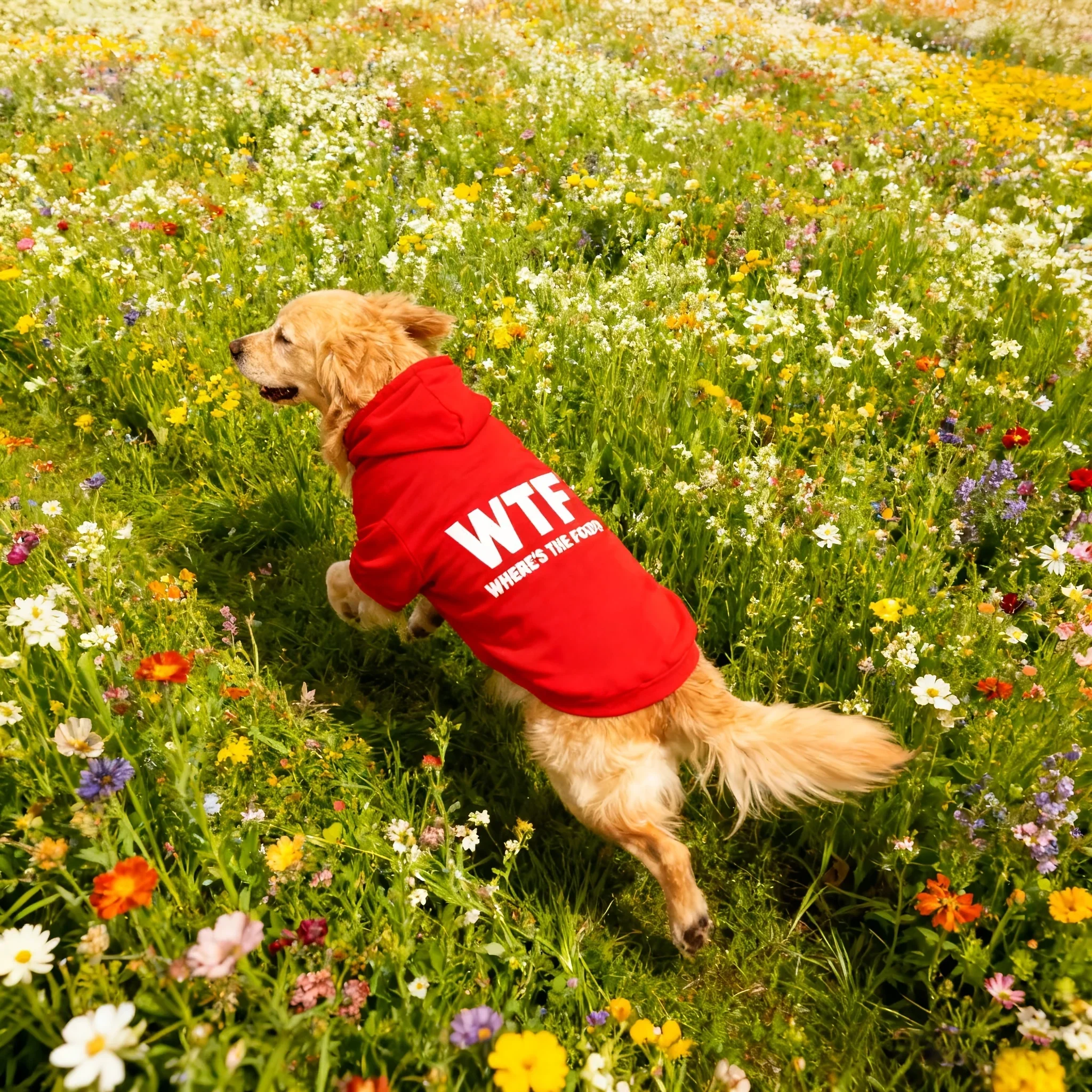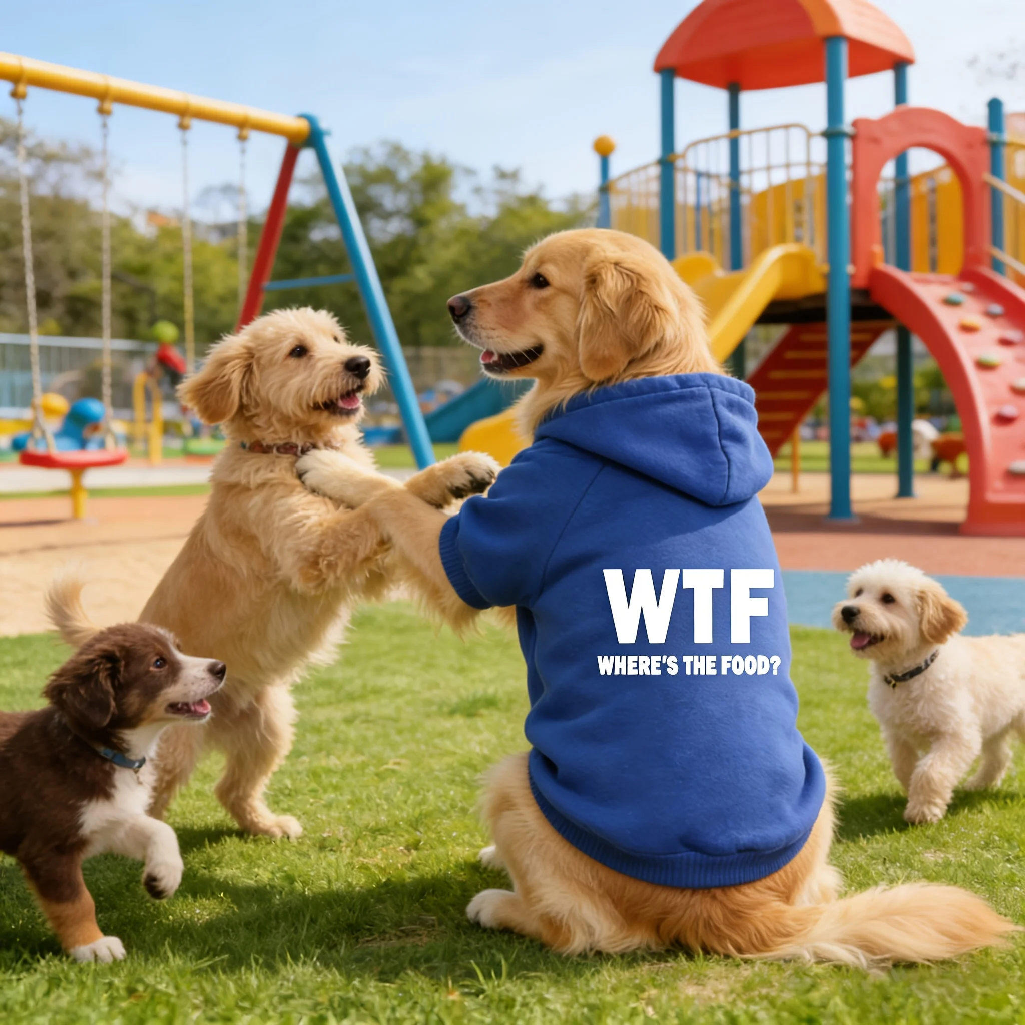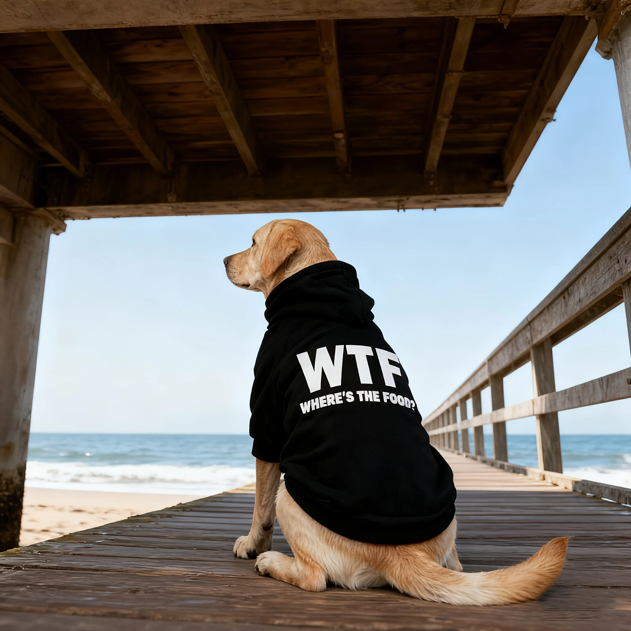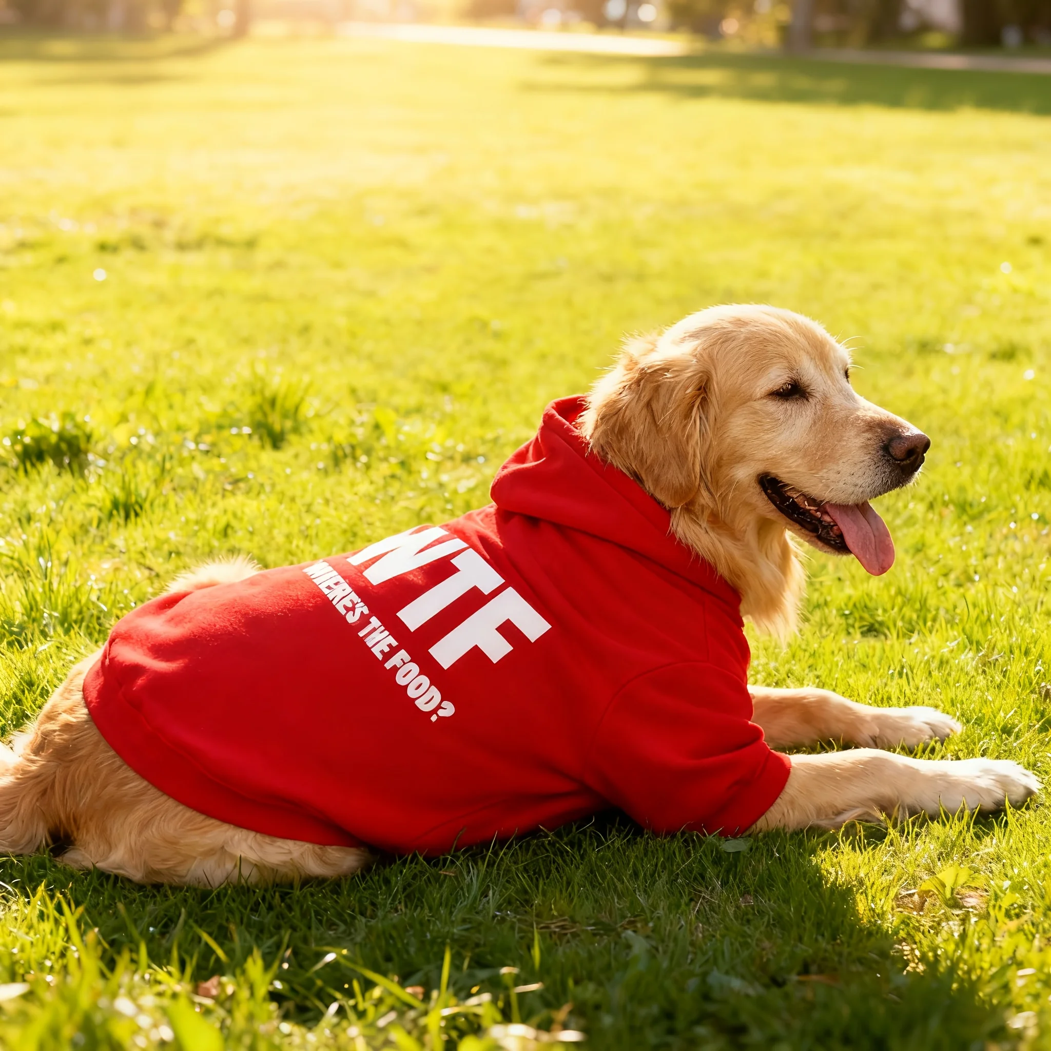 This New Pet Hoodie Features A 'WHERE'S THE FOOD?' Print, Designed Specifically for Medium To Large Dogs